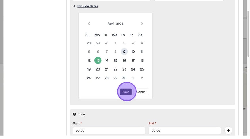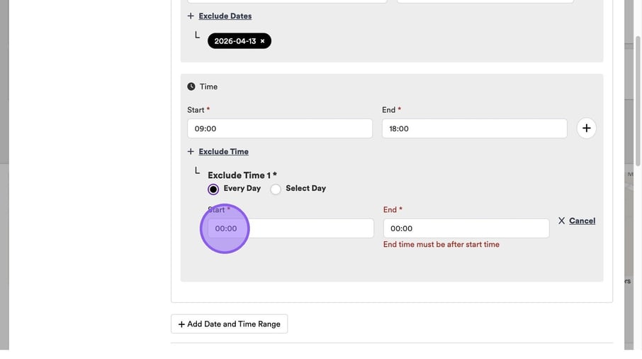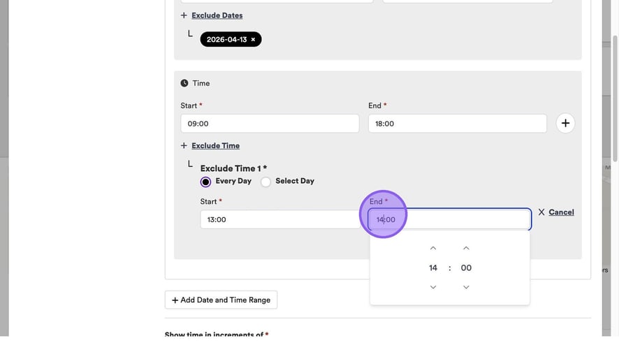 To set your excluded time, repeat the same process as setting your start and end time, by clicking this field and typing a time or using the arrows.
