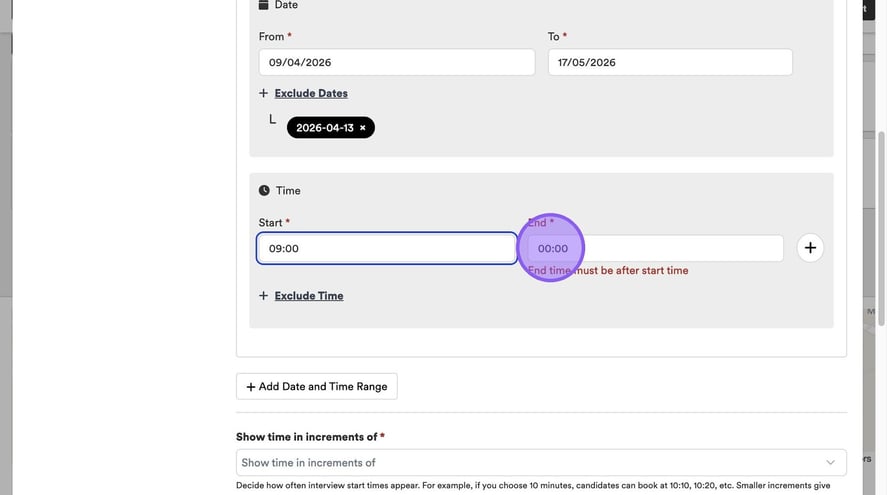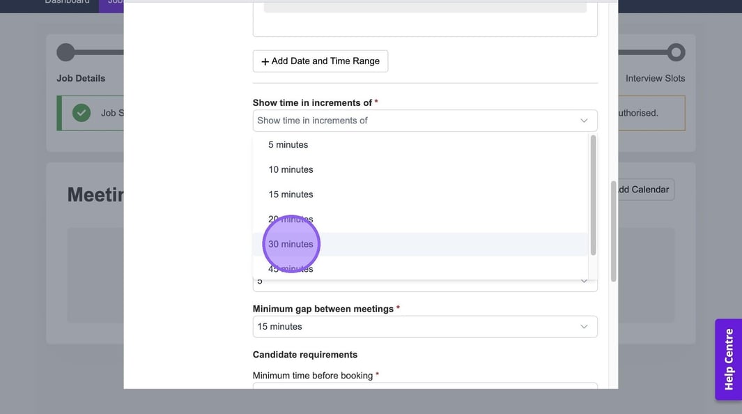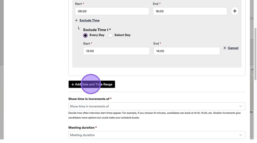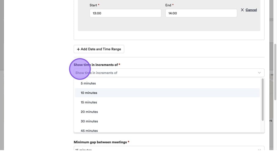 You will see a list of options to select from. For example, when choosing how often your start times will appear, be aware that a 10-minute interval allows bookings at 10:10, 10:20, and so on. Be aware that shorter intervals offer more flexibility for candidates but may result in a busier schedule for you.