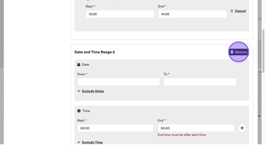 This will create a "Date and Time Range 2". If you no longer need this, or added it in error, simply click "Remove".