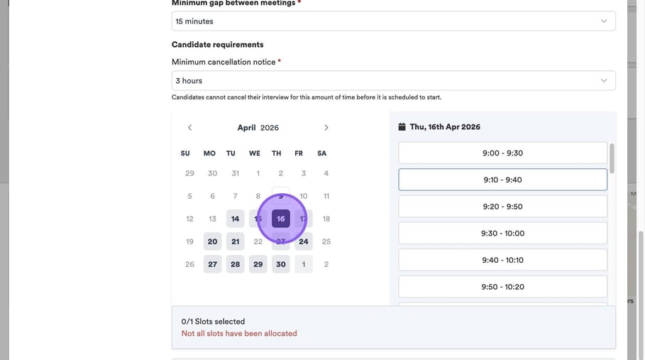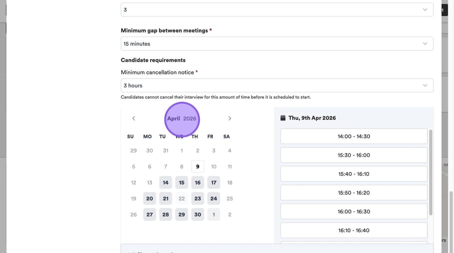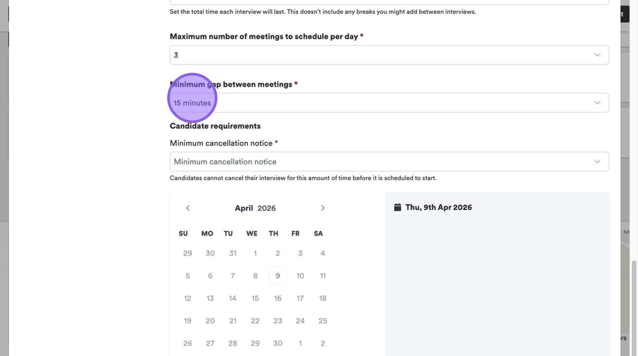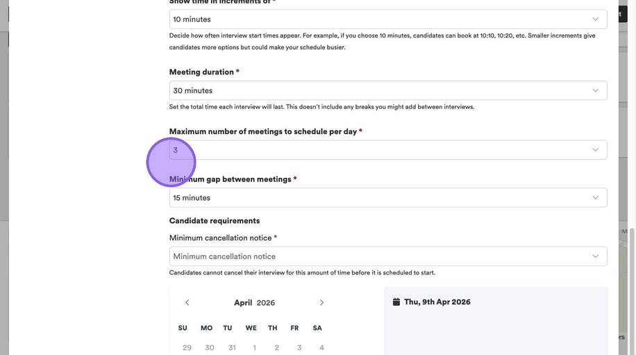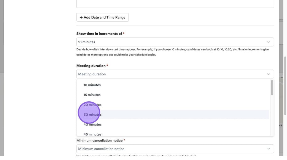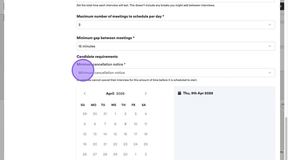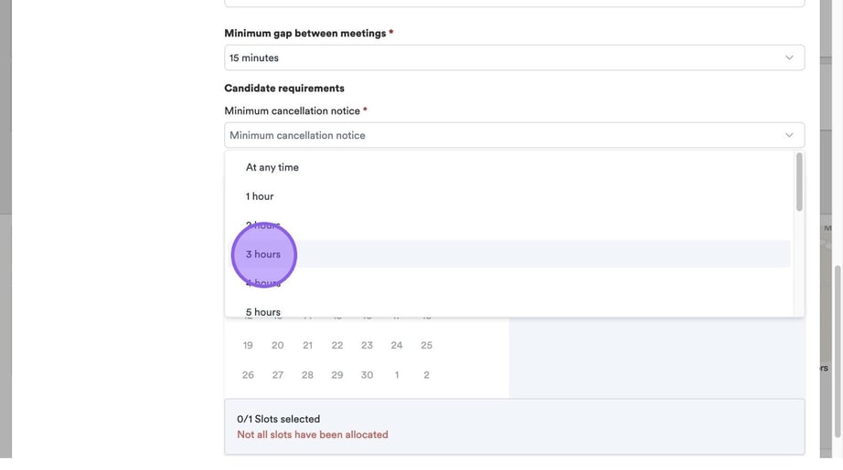 Click "Minimum cancellation notice" to set a period of time that a candidate can cancel their interview before it is due to start.