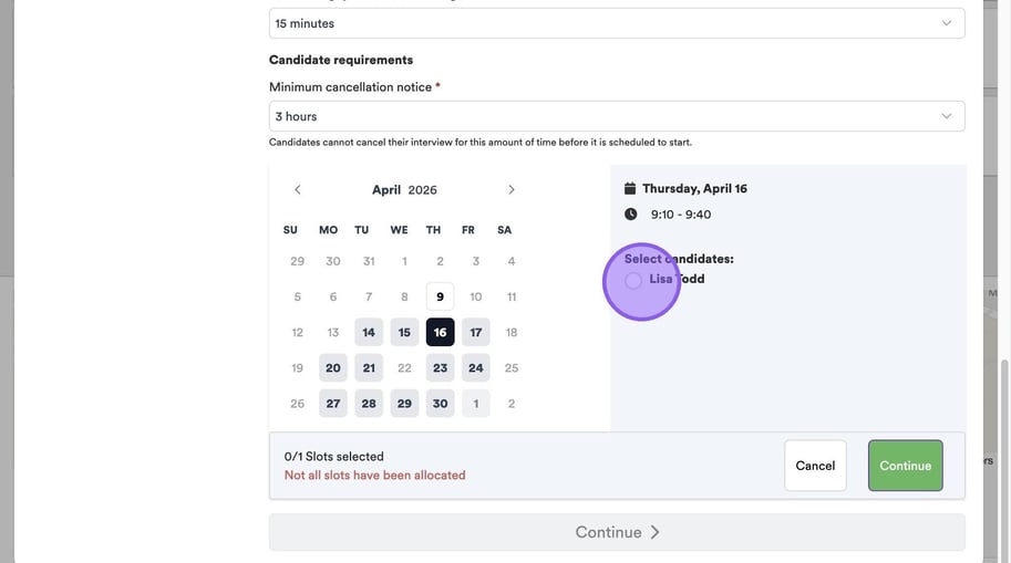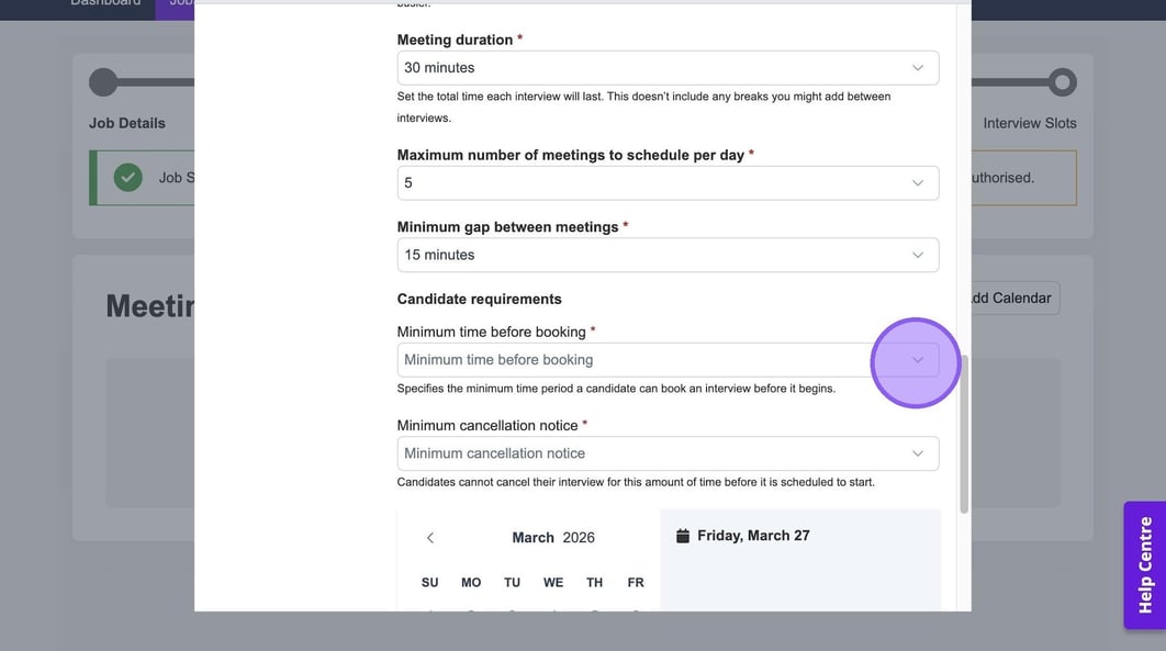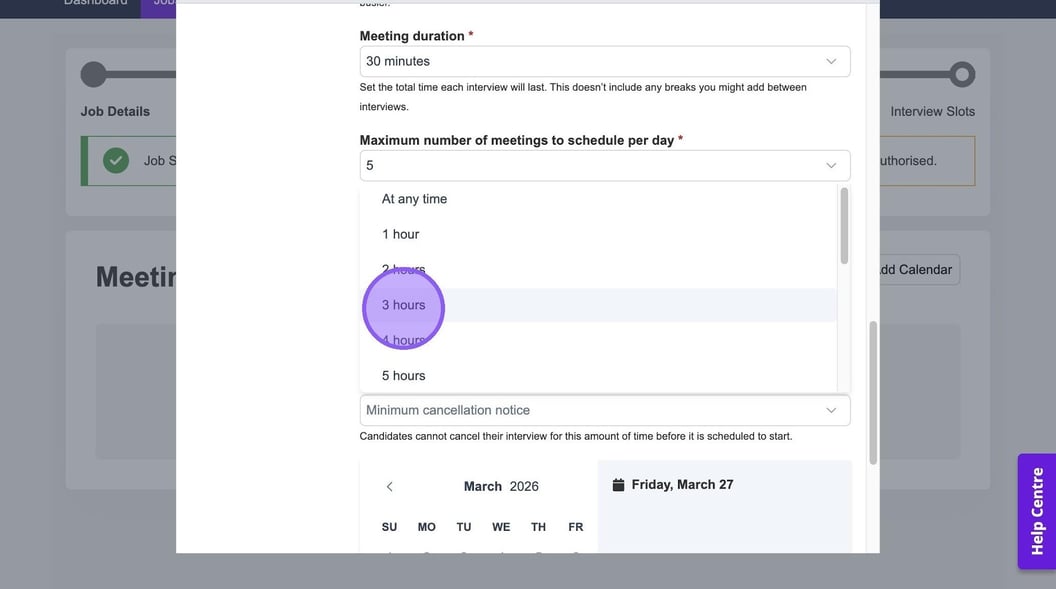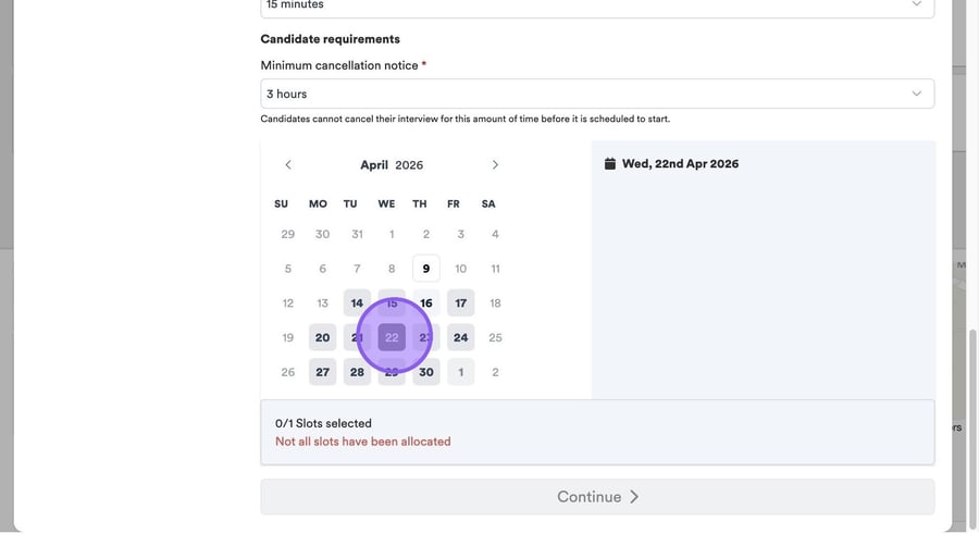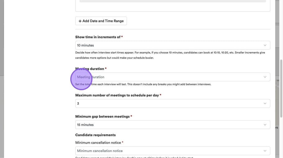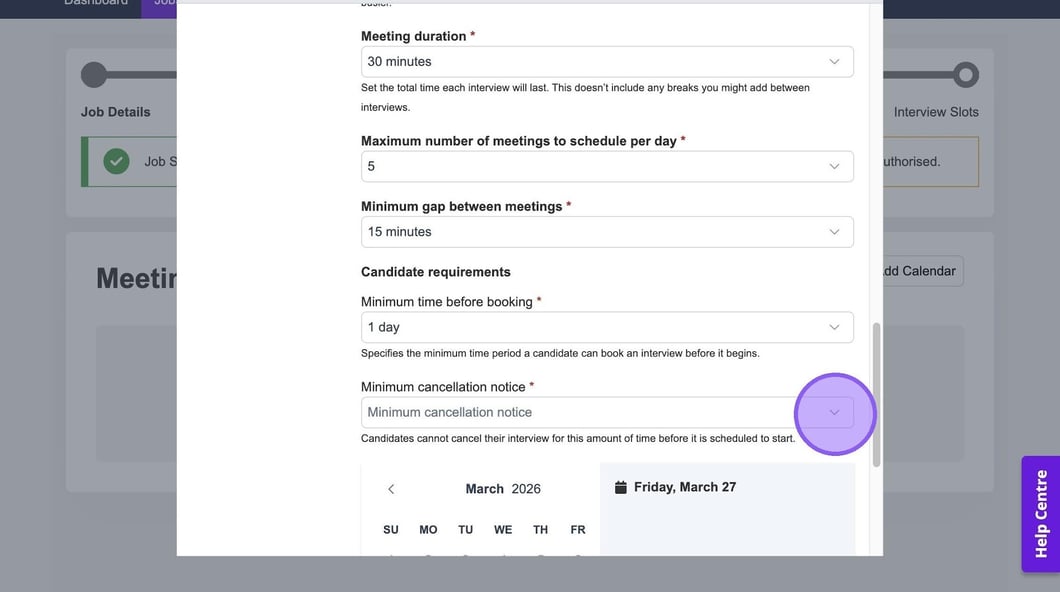 Click "Minimum cancellation notice" to set a period of time that a candidate can cancel their interview before it is due to start.