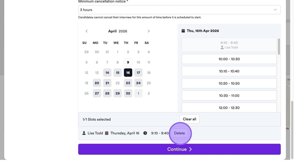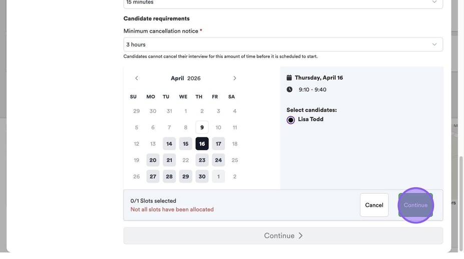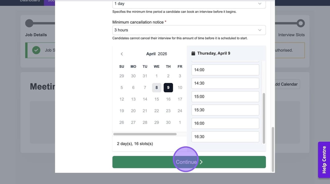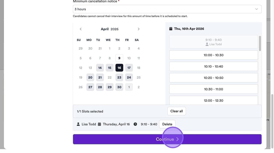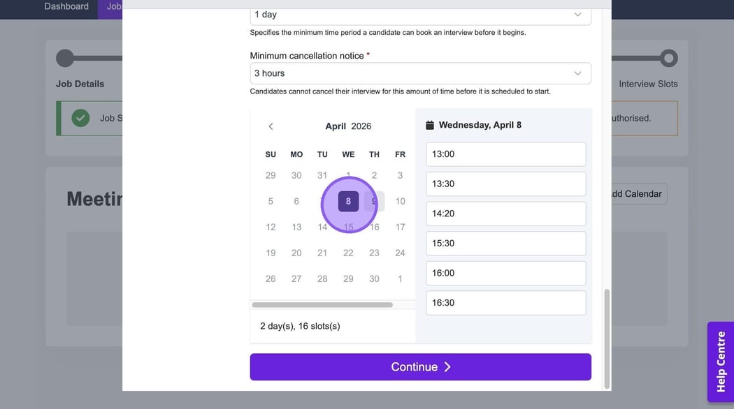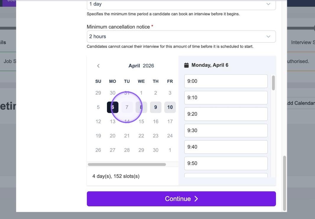 Based on the information you have entered in the previous steps, your linked calendar and any availability settings, you will now see available dates & times for you to book your interviews.