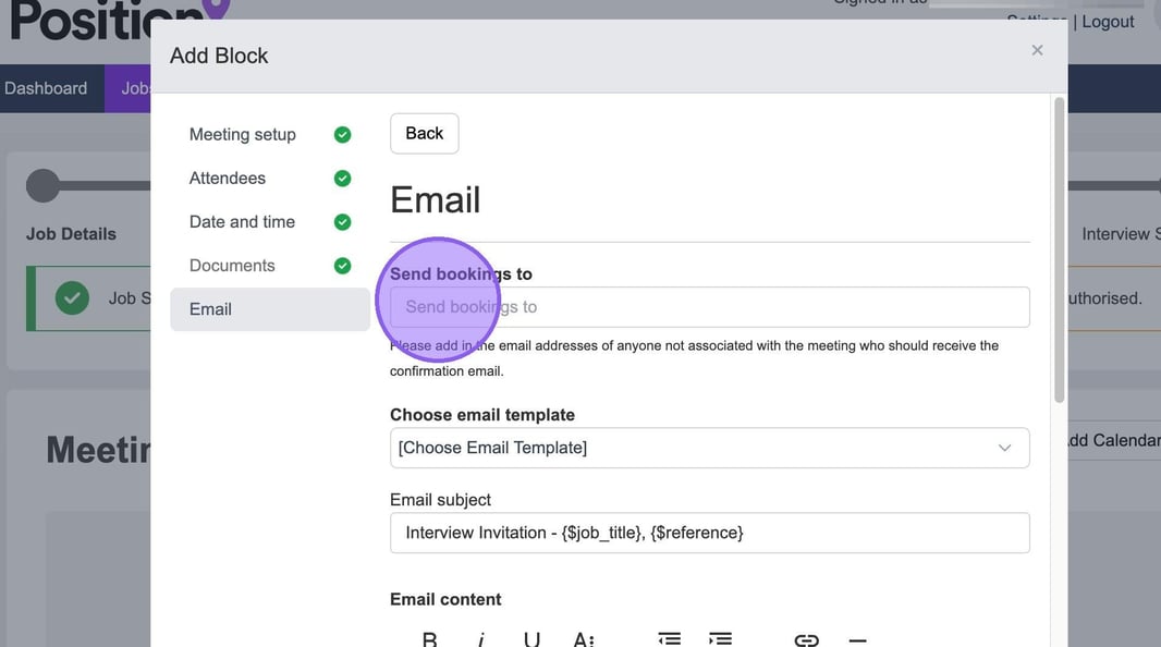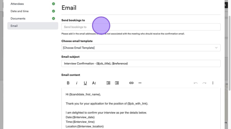 You will now be taken to the final stage of the process, where you are able to set-up any emails that will be sent to the candidate. To get started add any email addresses of any colleagues you have that will not be attending the interview, but need visibility on who you are inviting here.