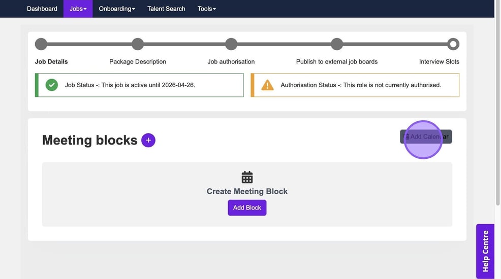 You will be taken to the following page, where you are able to set up your meeting blocks for your interview. Please note, you can also add your calendar from this page by clicking the highlighted button.
