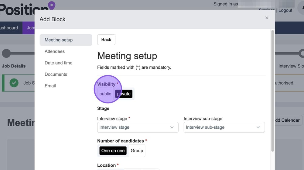 To set your visibility select either "public" or "private". If you set your visibility to public then it will show that you are conducting an interview on your calendar, if you set this to private the slot in your calendar will show as "busy" instead.