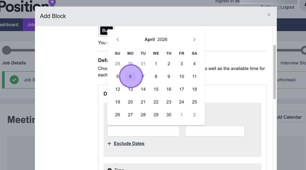 Now you will need to set your available times to interview by clicking this field.