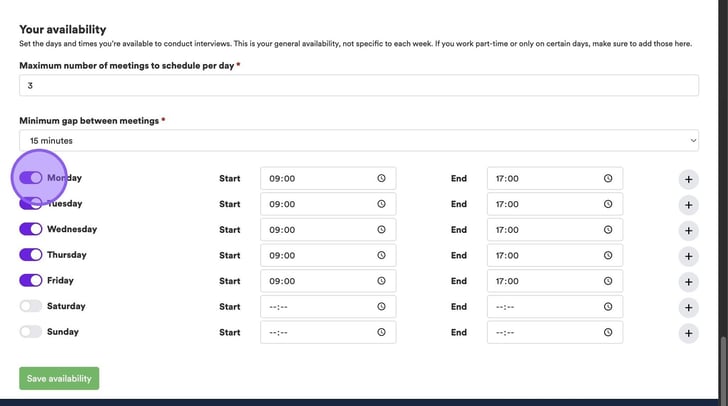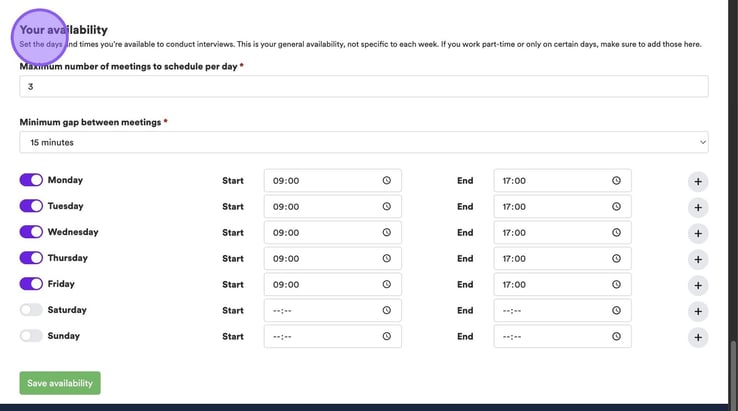 If you have a regular working pattern, you can also set this here by clicking on the appropriate toggles for each day, followed by entering your start and end times. Again, this information will factor in when you book interviews.