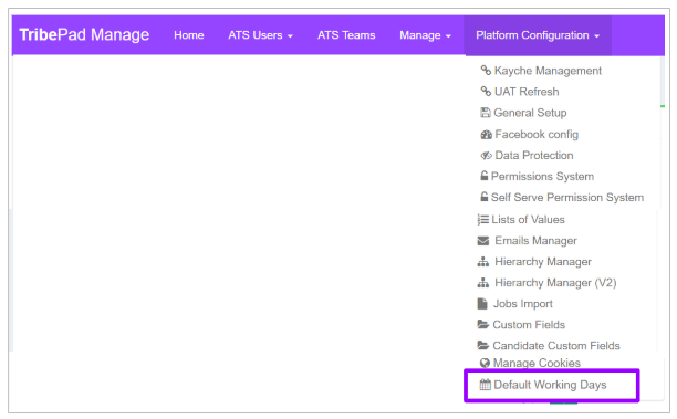 To do this, head to Manage 🖱️, and select Platform Configuration from the top menu followed by selecting ‘Default working Days’ from the drop-down list: