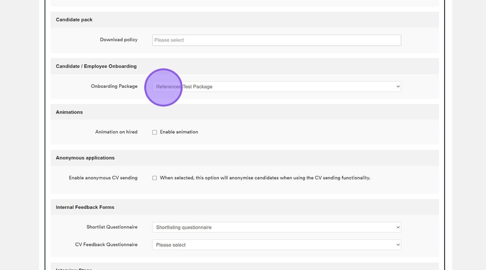Head to the "Candidate/Employee Onboarding" sub-section and click this dropdown and select the relevant onboarding package from the list.
