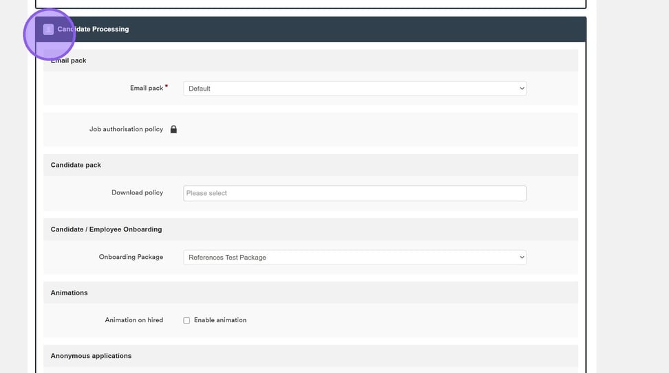 To add an onboarding package to a job, whilst on the job edit/create page, scroll down to the "Candidate Processing" section.