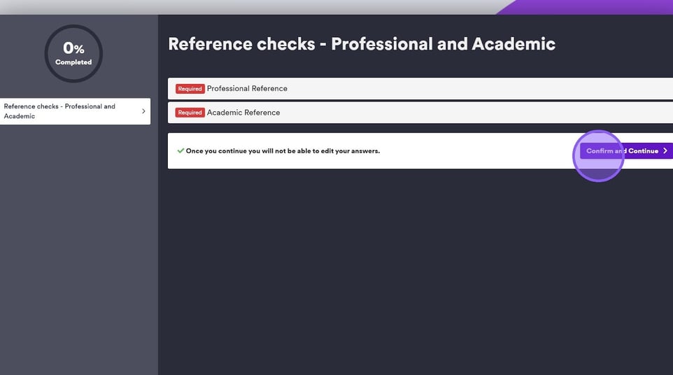 You will now be taken to the following page, where you will need to click "Confirm and Continue" to submit your reference checks.