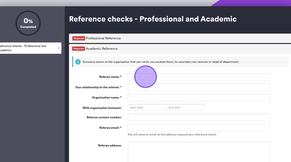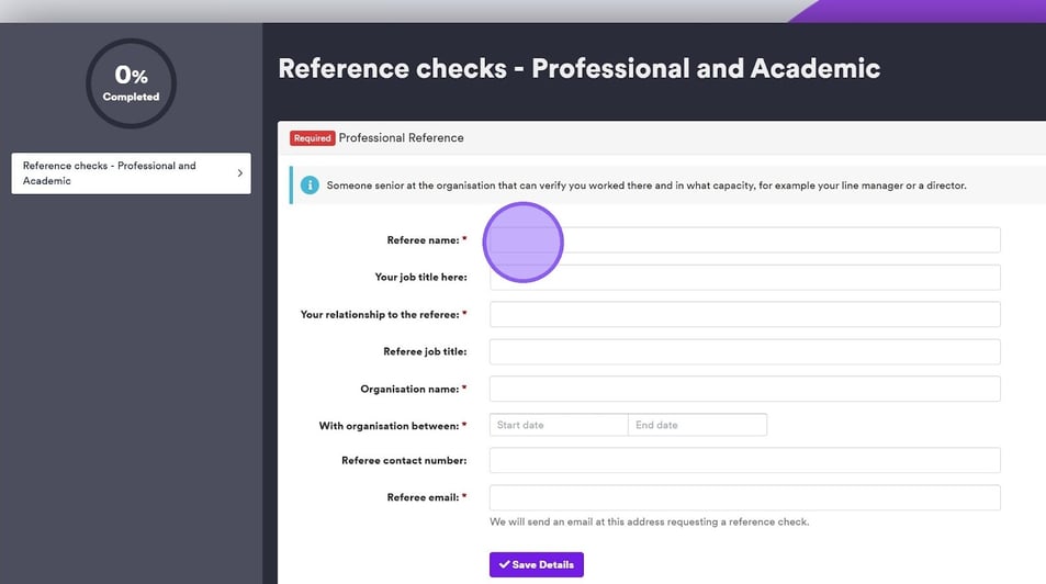 To complete your reference checks, click in each of the relevant fields and complete as requested.