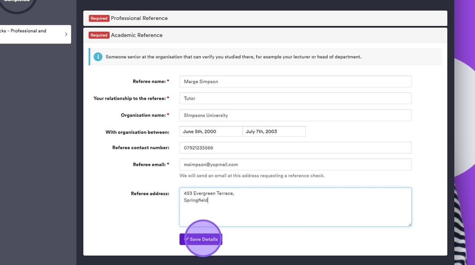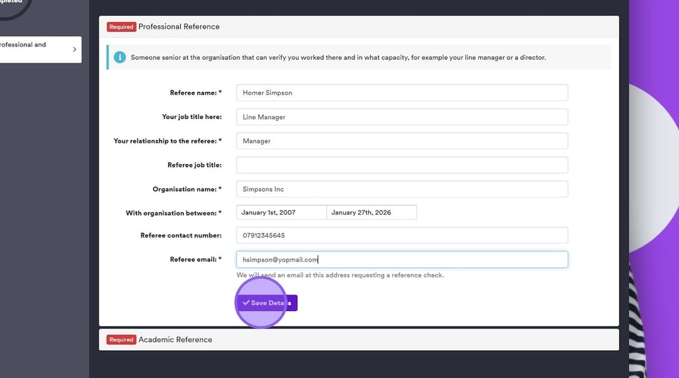 You may be asked to provide more than one reference, for example Professional and Academic. If this is the case, you will be asked to provide further information for another reference, To do this repeat the previous steps.