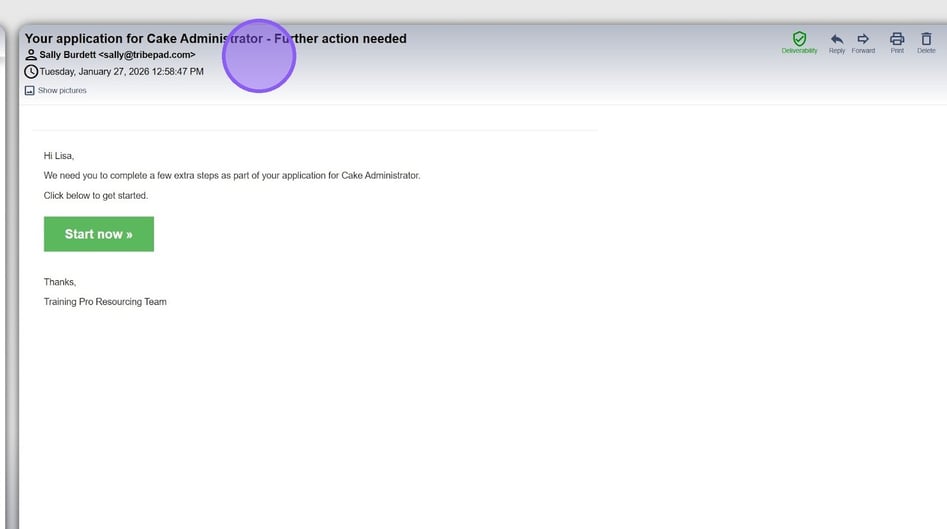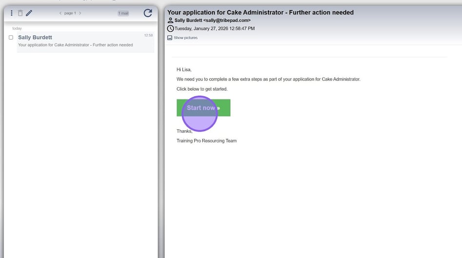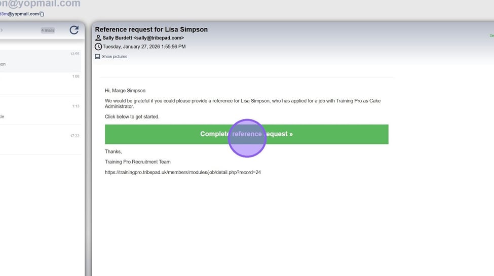 To complete the reference check, the candidate must click the "Start now" button from within their email.