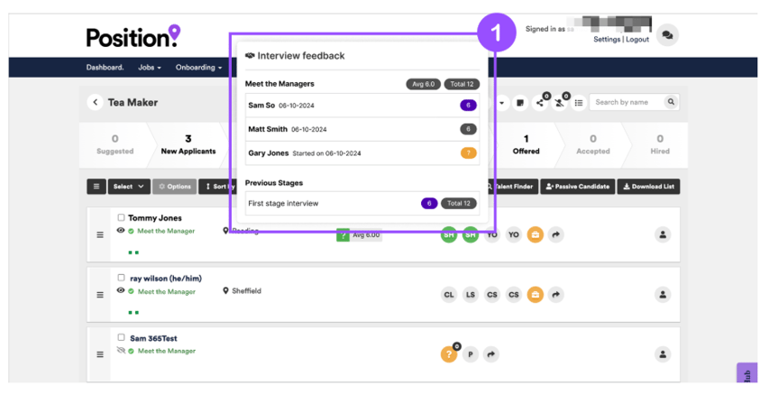 Panel scoring remains fully supported when using multiple process questionnaires. You can view any panel scoring options in exactly the same way as outlined in the section above, and the system will show any scores in the pop-up next to each candidate (1).