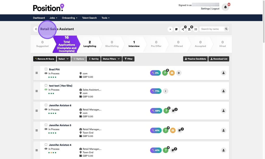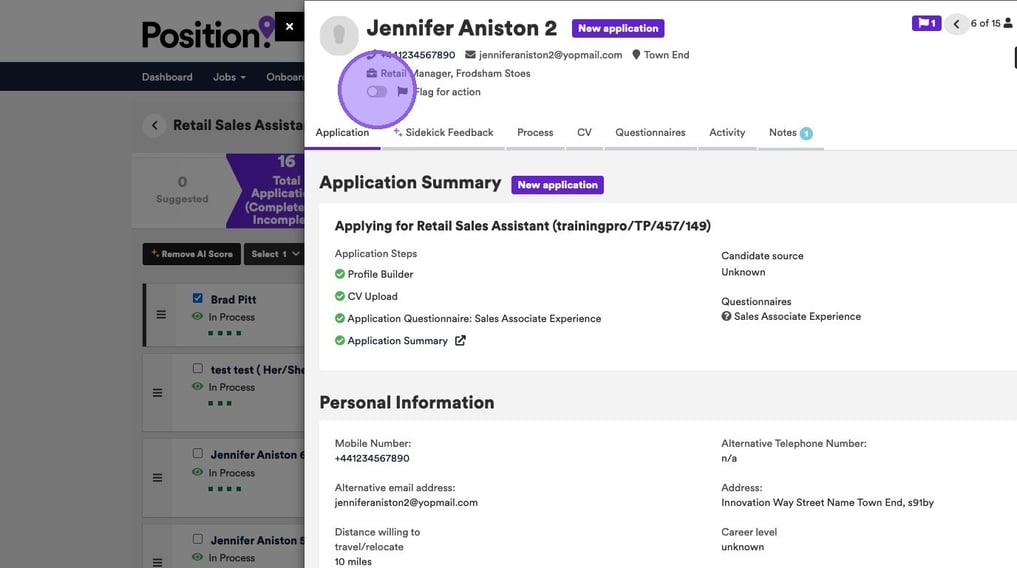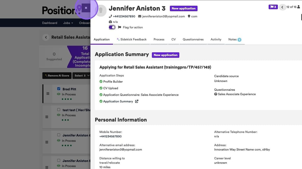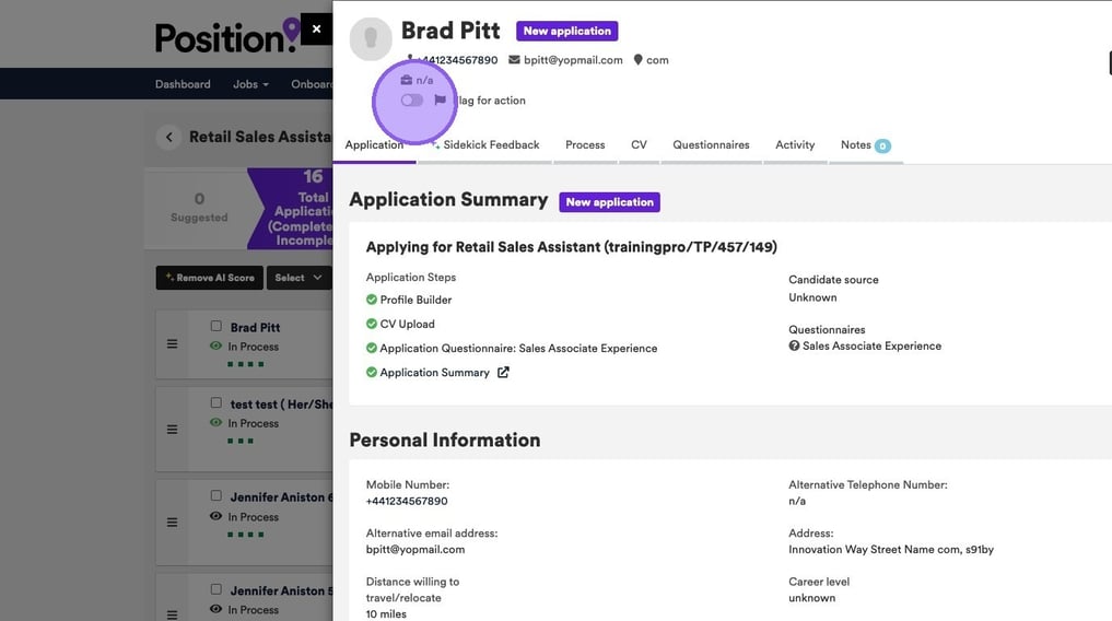 The application progress dots provide you with a quick view of steps that may need to be carried out, allowing you to prompt candidates that still need to complete their application.