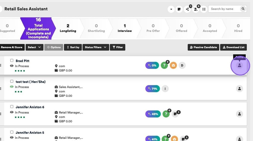 There are multiple actions that you can take to screen your candidate to see if they are suitable for the role you are recruiting for, starting with the candidate profile.