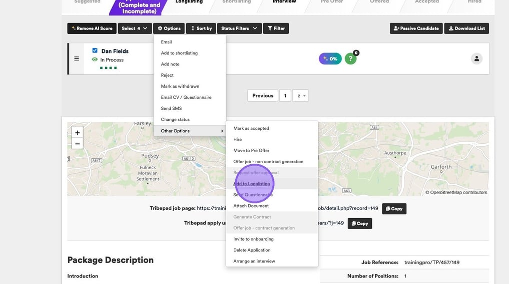 It links to the “Options” menu and allows a Recruiter to perform certain actions against the candidate, e.g. move to Shortlist, arrange an interview etc.