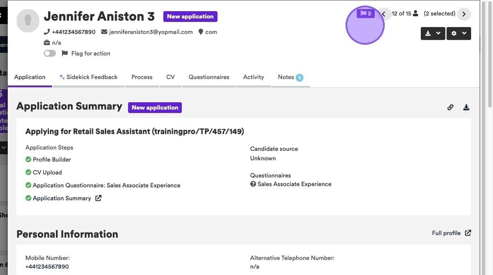 The section underneath (3) outlines any other roles that the candidate has applied for, and allows you to view an application summary.