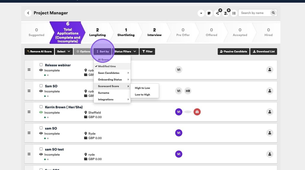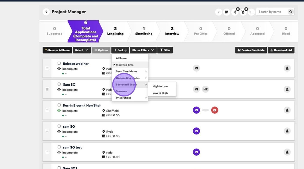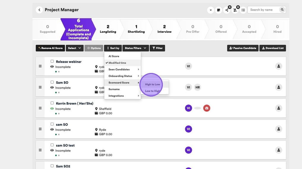 To do this hover over the purple “VI” icon next to a candidate's name, this will bring up a link to the video interview recording as well as a mini score card:
