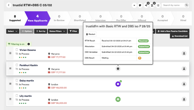 - RTW/DBS Result: Indicates if the result is with TrustID or ready for review.